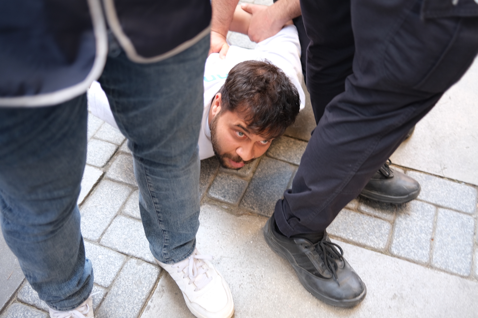 Detainees were handcuffed behind their backs and taken to police vehicles. They were kept in handcuffs behind their back in the stuffy vehicles. All that remained of the police violence was one shoe of a pair belonging to an activist, on the street. Police forced the activist into the vehicle with only one shoe on