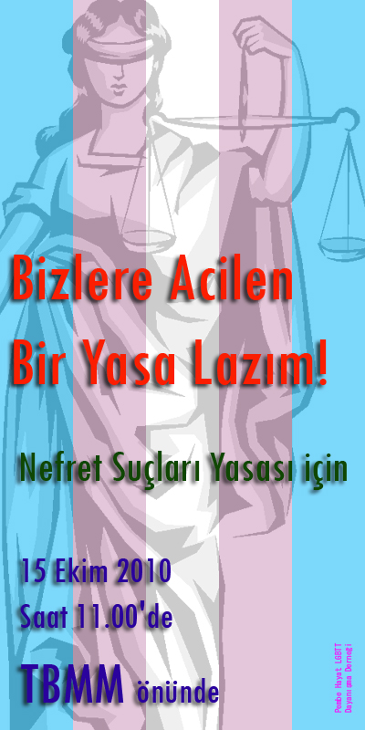 Bütün bu faktörleri de göz önünde bulundurarak, 15 Ekim 2010 tarihinde, saat 11.00'de TBMM önünde yasa yapıcı ve karar vericilerin gözleri önünde bir defa daha trans bireylerin maruz kaldığı nefret cinayetlerini protesto eden ve demokratik taleplerimizi dillendiren basın açıklamamızı yapacağız.